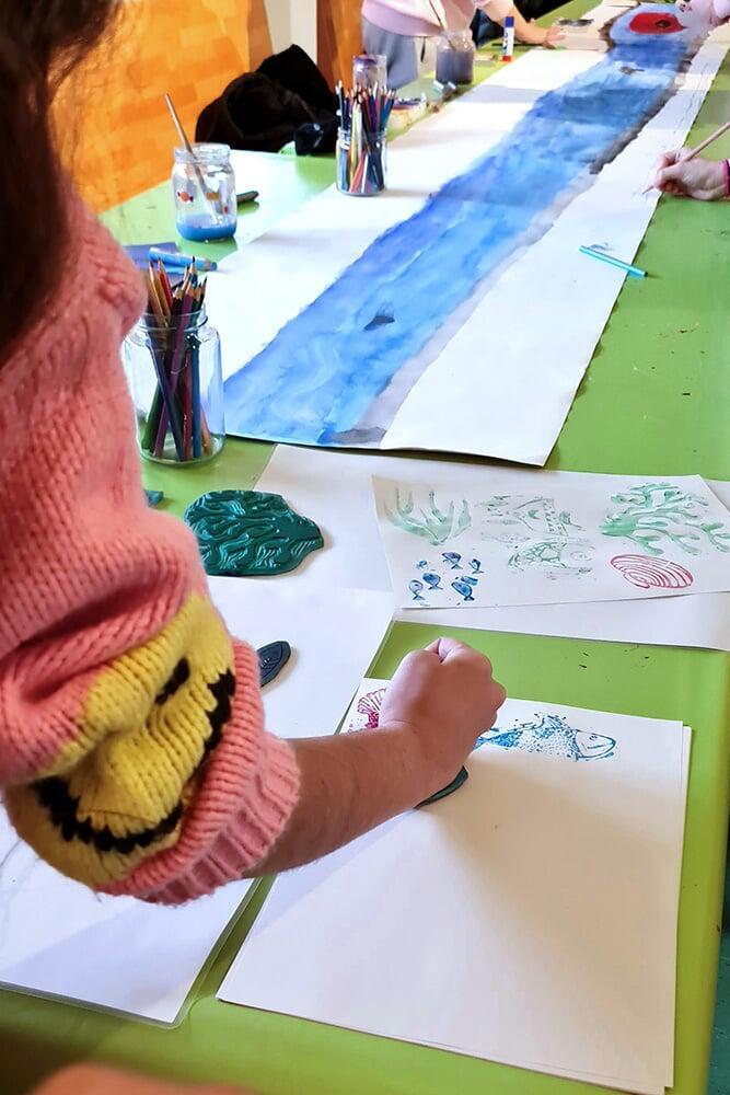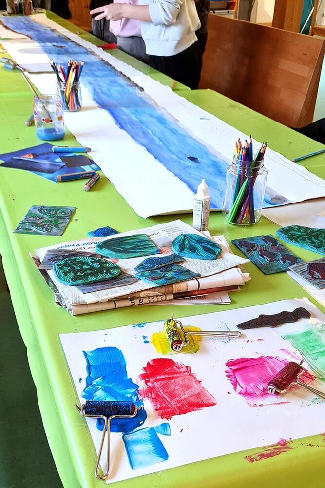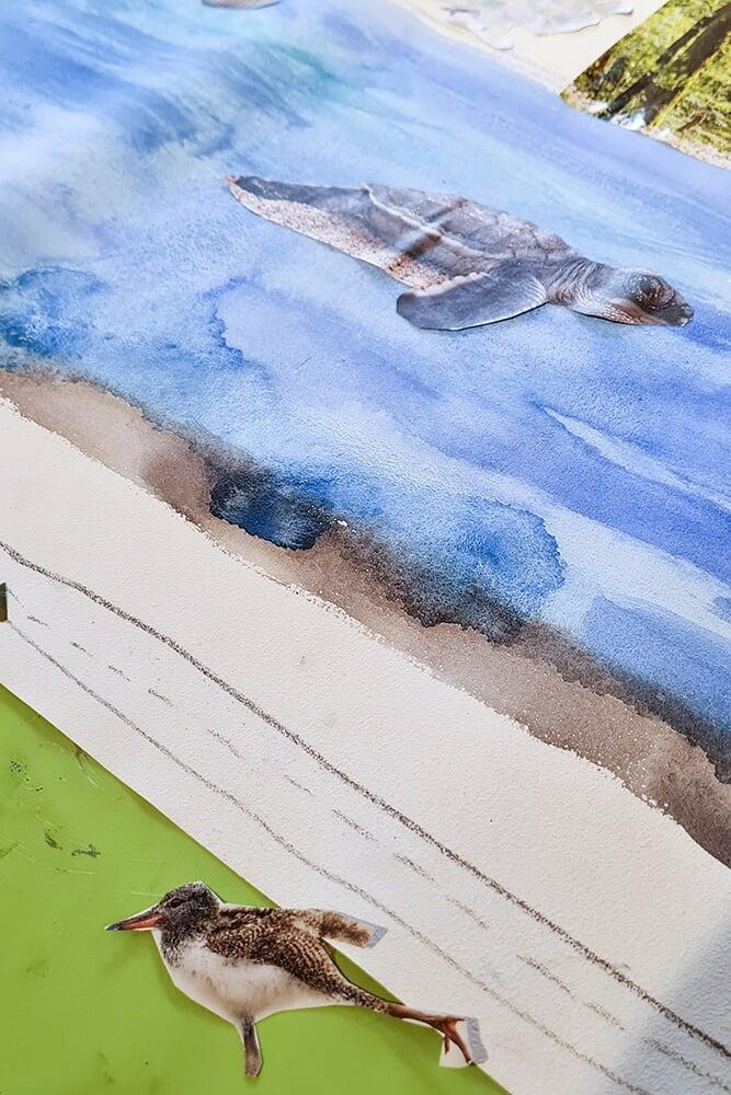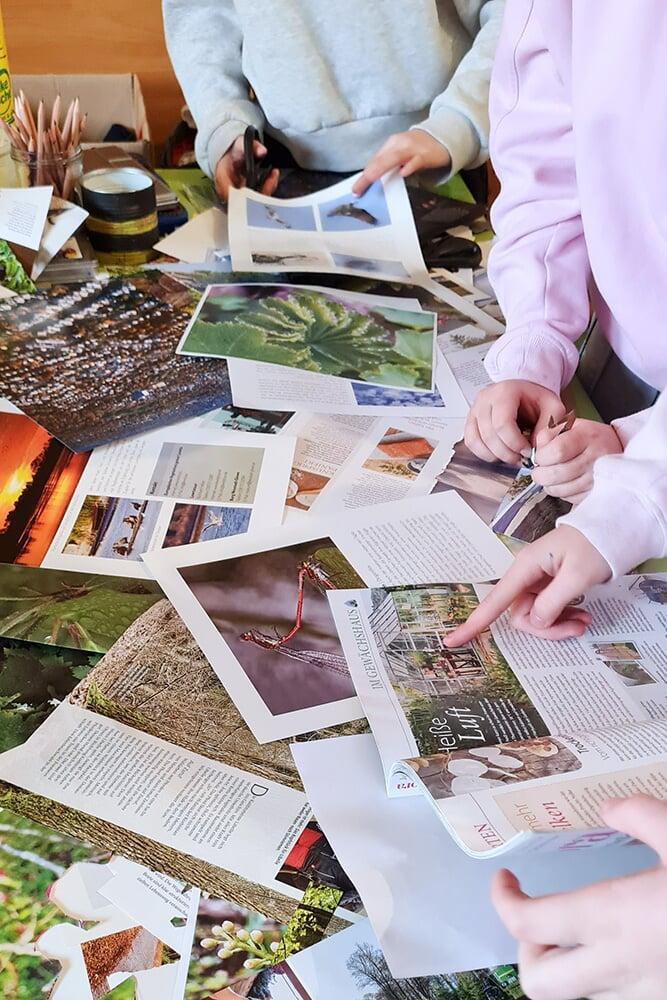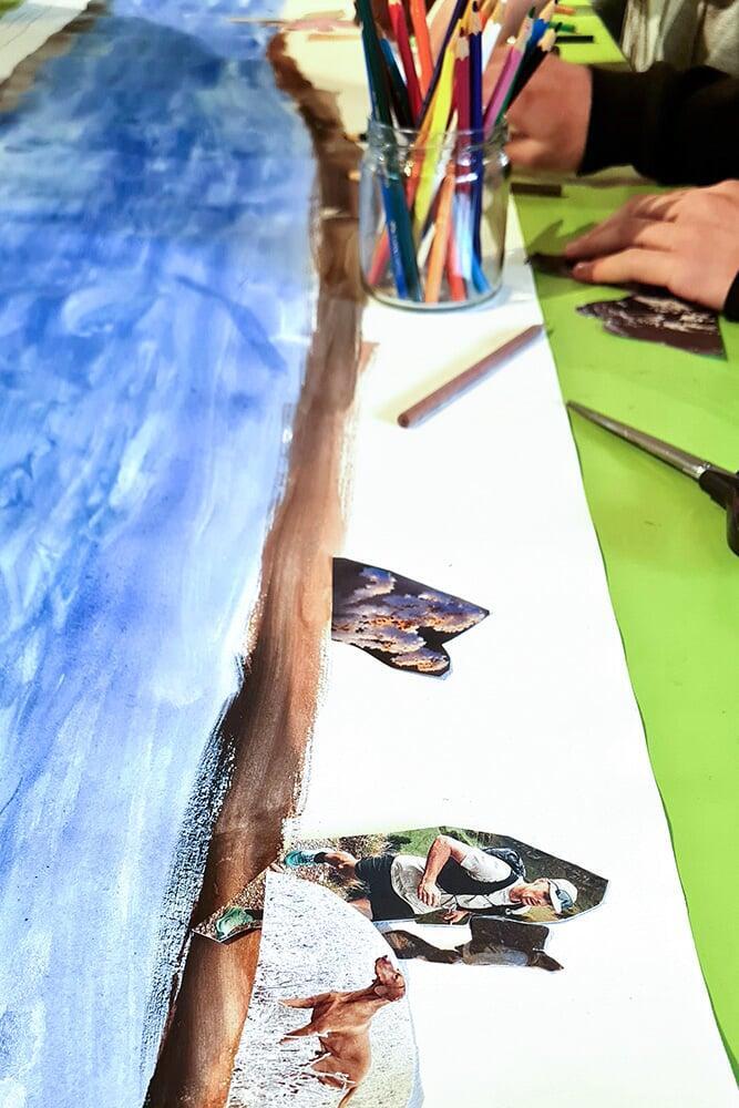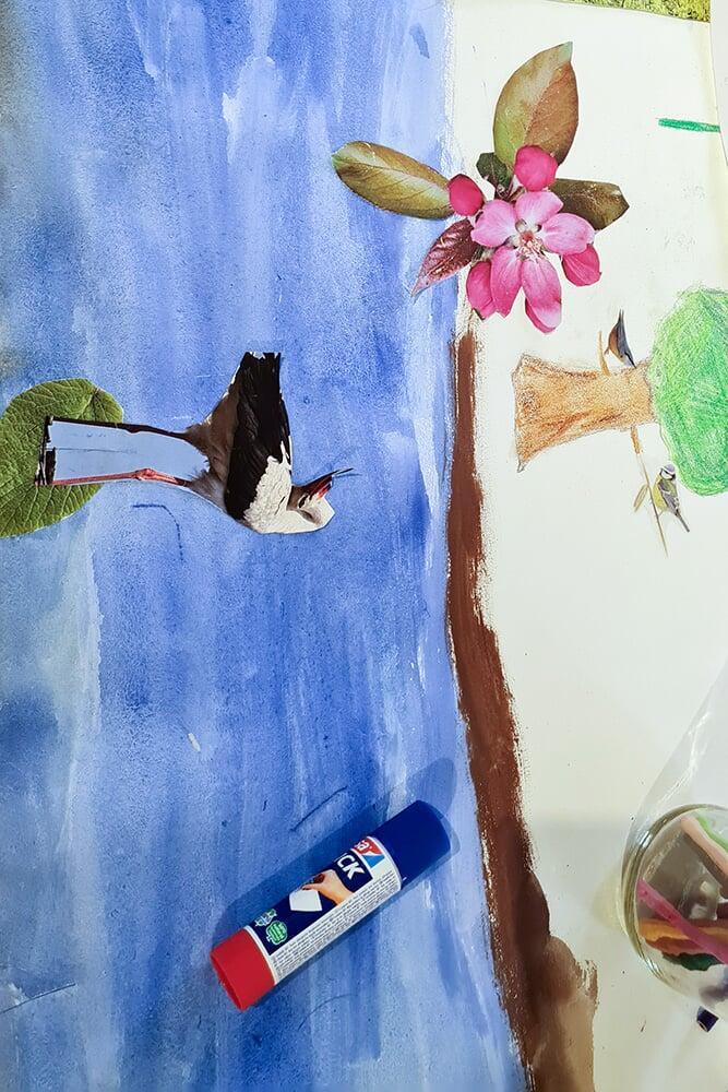 Mit Pinseln und Farben, Stiften und bunten Collagepapieren wurden zahlreiche Szenen gestaltet,