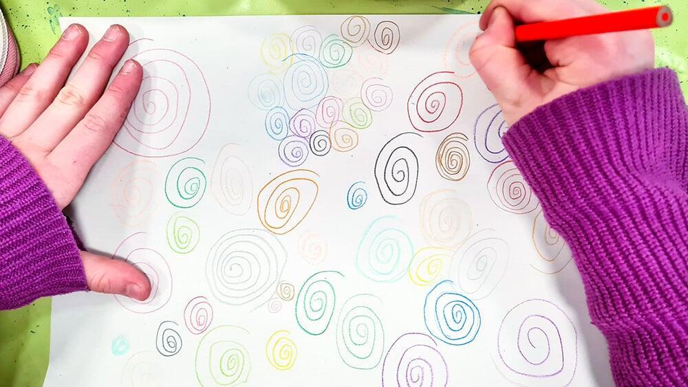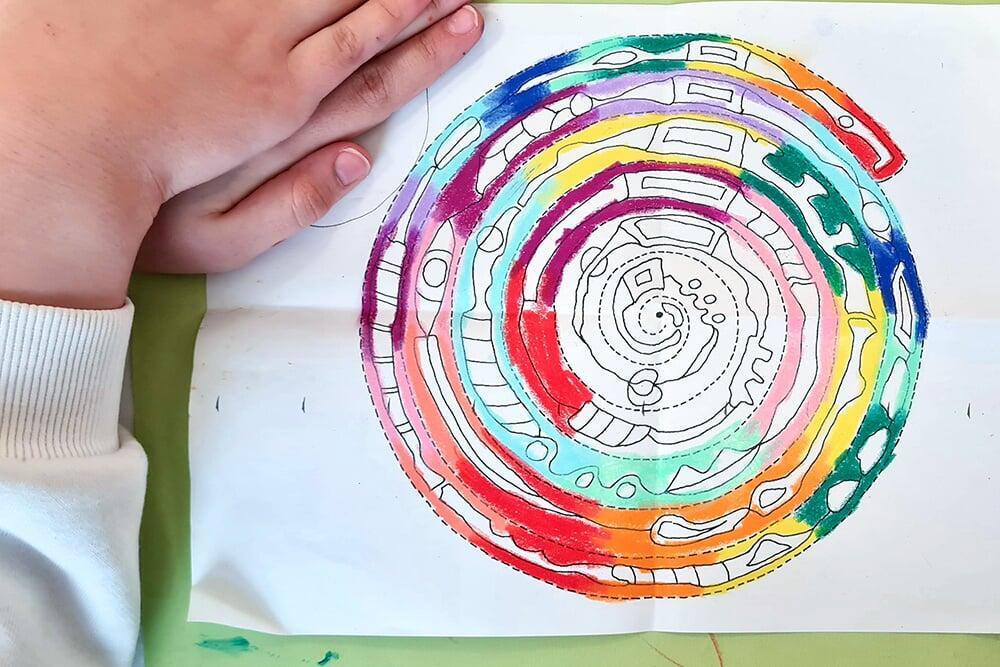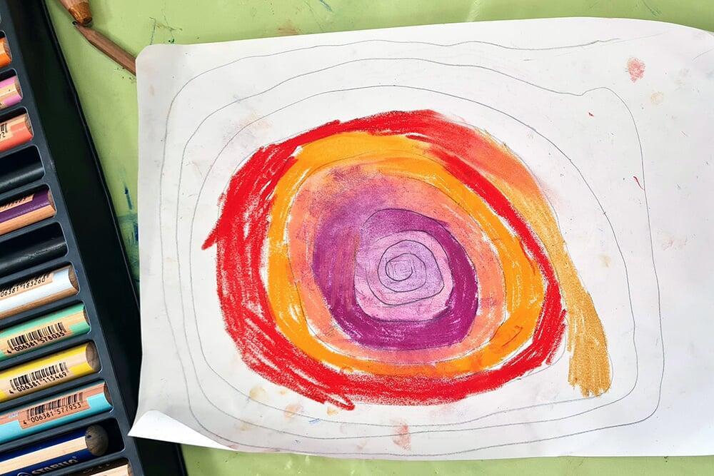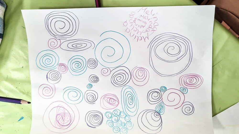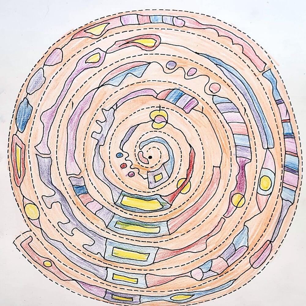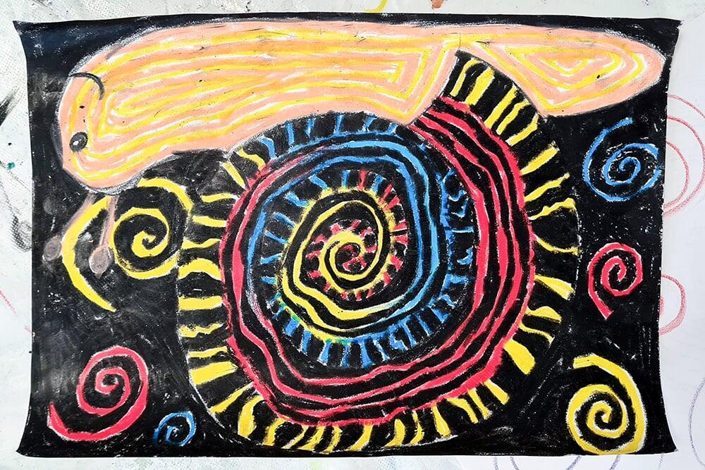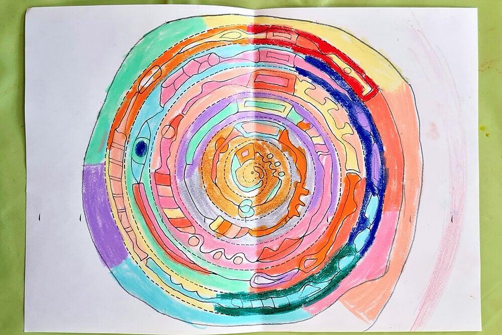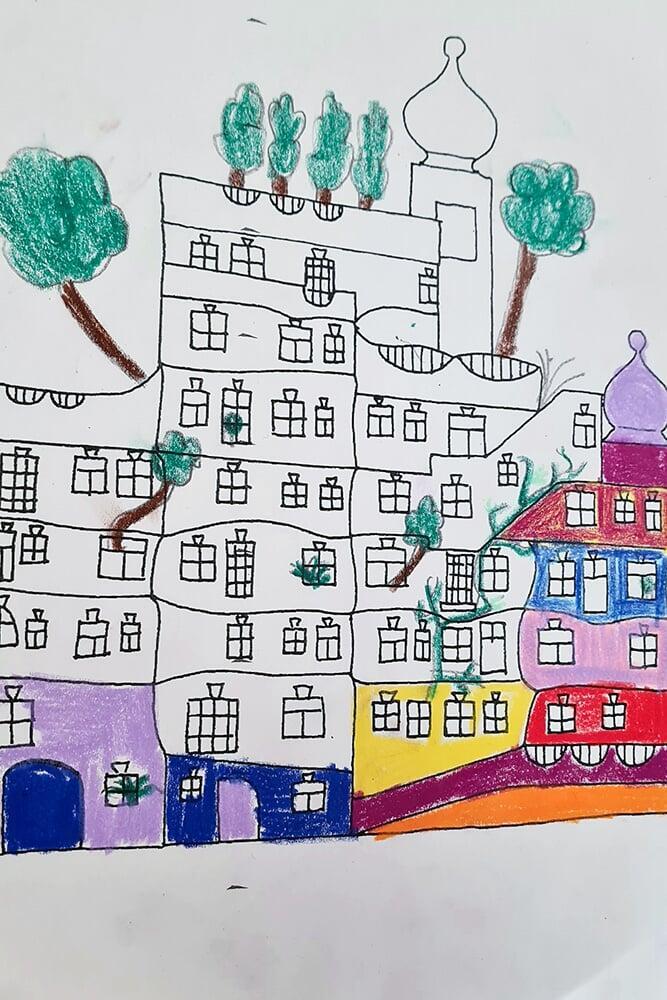 Auch Hundertwassers berühmte Spiralen wurden zeichnerisch erkundet. Sie stehen symbolisch für Wachstum, Bewegung und den Kreislauf des Lebens und boten den Jugendlichen viel Raum für eigene Interpretationen.